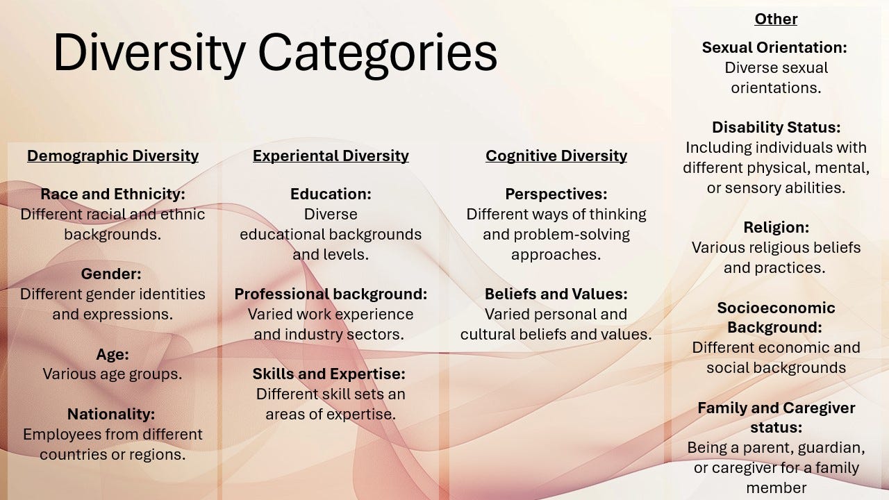 Other Dimensions: Beyond demographic, experiential, and cognitive categories, there are other critical aspects of diversity such as sexual orientation, disability status, religion, socioeconomic background, and family or caregiver status. These dimensions address the deeper layers of diversity, ensuring that all forms of human identity and experience are recognized and respected.